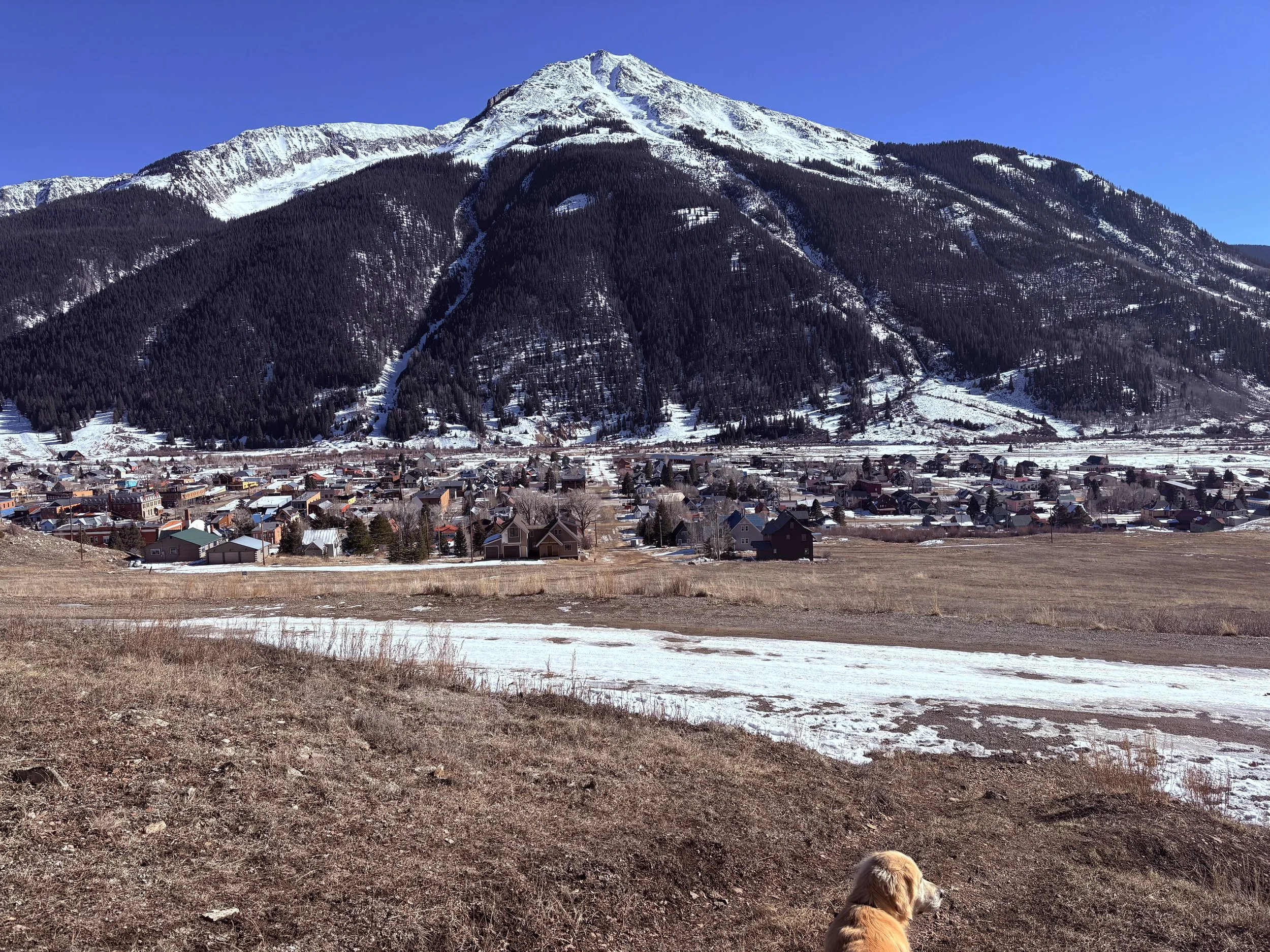 View of town from Shrine Hill on January 20, 2026. Typically, I cross-country ski this loop directly from my house. Instead, we are all still wearing our mud boots.
